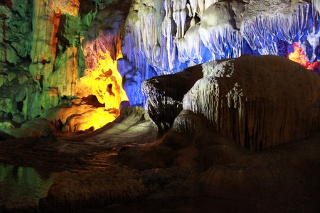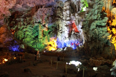 天宫洞(Ha Long Bay)是下龙湾不可错过的美景之一。天宫洞总面积为3000平方米,宽25米,长120米,高20米左右。天宫洞的美如同天上的宫殿一般。这里有经数百万年造化形成的多彩多姿的巨型石乳。