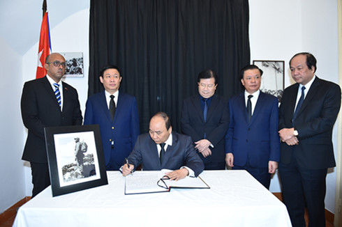 越南政府总理阮春福在古巴驻越南大使馆向菲德尔·卡斯特罗敬献花圈