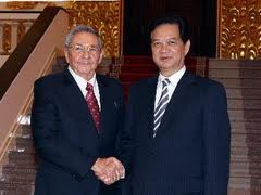 越共中央总书记阮富仲在欢迎劳尔.卡斯特罗及其一行的酒会上致辞时表示,劳尔.卡斯特罗此访是一次兄弟间的串门。越南领导人和人民迎接劳尔.卡斯特罗就象迎接回家的兄弟。阮富仲表示,100年前,古巴英雄何塞·马蒂在其作品《黄金年龄》中向古巴人民介绍了勤恳耐劳、英勇无畏的越南民族。随着时光流逝,两国关系日益深化,并凝成了菲德尔.卡斯特罗的一句话:“为了越南,古巴愿付出自己的鲜血”。阮富仲重申,尽管经历了历史变迁,但古巴党、政府和人民永远是越南始终如一、至真至诚、同一个理想、同一条战壕的朋友,一向与越南人民在民族解放斗争及建设和保卫国家事业中并肩前进。劳尔.卡斯特罗指出,古越关系因共同的理想和共同捍卫民族独立的斗争历史而更加密切。两国人民永不忘记菲德尔.卡斯特罗主席1973年访问越南广治省时高举南方民族解放阵线旗帜的形象。当时正值越战激烈,广治省刚刚得到解放。这表明,两国关系是久经考验、始终如一、无私合作的关系,应得到双方的继承和发扬,并体现在双方签署的协议中。劳尔.卡斯特罗说:“我们永远怀念胡志明主席。他领导越南人民建立了东南亚第一个社会主义国家。我1966年首次访越时,有幸见过他老人家。古巴人民永远与越南人民肩并肩,共同培育两国兄弟般的友好情谊。我相信,这也是两国人民的愿望”。