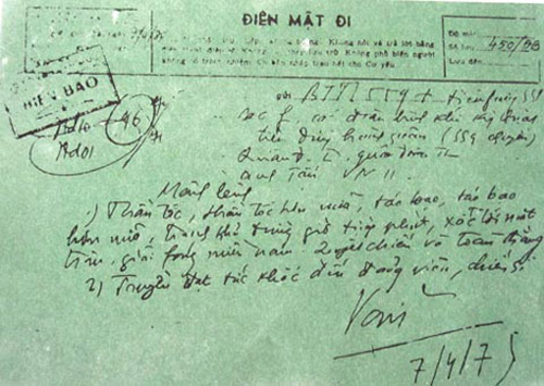 1975年4月7日,位于河内古城区D67号的胡志明战役指挥所发出一道密令,其中写道:“神速、再神速、大胆、再大胆,争取每分每秒解放南方,决战,全胜。立即传达给党员和战士们”,署名为 “文” 字。这封急电立即由机要处加密,并发给参加解放南方战斗的各种力量。
