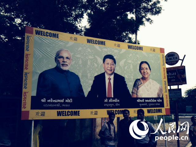 | 习近平访印第一站古吉拉特邦是印度总理莫迪的故乡。图为当地人在欢迎习主席的广告牌下合影 |