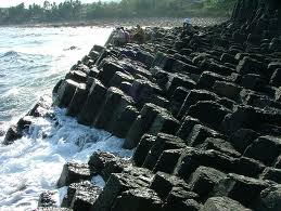 远远看去,石柱林就像一个个盘子整齐码放在一起。而走近细看,就会发现原以为各自独立的石柱原来是面积达到一平方公里的一块大石头。这块岩石裂成一根根六角形或圆形石柱。估计约有三万五千根石柱排在一起,形成了这处自然景观。延伸入海的盘子玄武岩石柱林构成了这里奇特难行的地貌。地质学家认为,这是距今几百万年前地质运动形成的玄武岩景观。