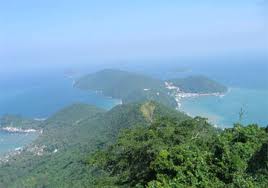 两点五公里长的柏油路一直延伸到海拔三百米的山顶。这段路弯曲、陡峭,有的山腰路段阳光直射,有的则浓荫覆盖。从高处眺望,脚下的大岛被二 十一坐小岛环绕,仿佛西南部地区的又一个小下龙湾。