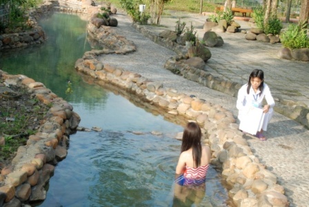 温泉绕清新度假区外围而过。这里的浴池、泳池是按照单向水流建成。泉眼涌出的泉水流入池中,再从其他排水系统排出,水温三十五至四十二度,高低有别。在温泉泡一天的单人费用只有五万越盾。如果喜欢天然香料温泉,双人收费二十万越盾,水力池单人费用为十五万越盾一小时。