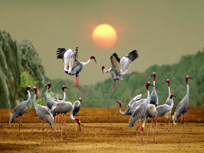 长着灰色的羽毛,又大又长的翅膀,脚又细又长的赤颈鹤每次在黄昏时飞翔就像是大自然充满魅力的舞蹈。这个时刻被很多摄影师抓住,创作出令人印象深刻的作品,并在国内外摄影比赛上获得多项大奖。