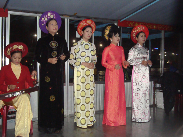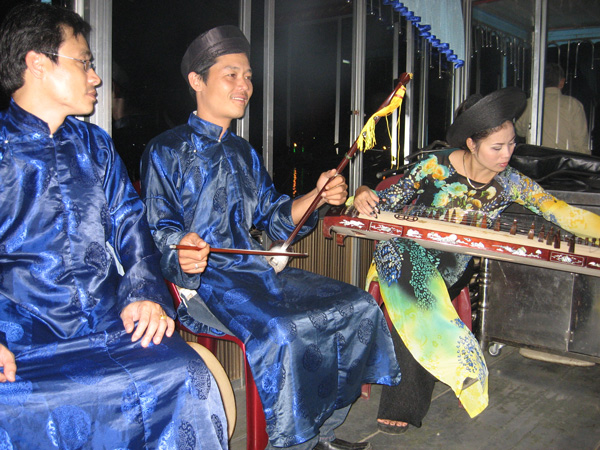 在静谧的夜色中,响起了筝、琵琶、月琴清脆悠扬的乐声,交织成一曲婉转轻柔的船歌。此情此景让陶醉其中的人们仿佛置身于如醒如梦的天堂。“流水”、“金钱”、“春风”、“浪呼”等四首顺化宫廷礼乐把观众带回到雄伟壮观、辉煌灿烂的古代宫廷中。顺化民歌深得顺化文化韵味,融入了顺化人软语轻柔的语音特色。有的感时伤怀,有的风情万种。它既是发乎肺腑之歌,又是香江秀丽风光的写照,更是多愁善感的顺化少女的心声,让人迷之醉之,不忍离去。