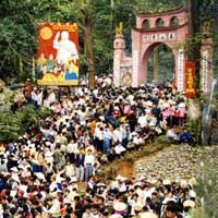 走在前往雄王庙的路上,两旁是一行行参天古木,山道的美景让游客忘却了疲劳。凉风阵阵吹袭,耳边鸟语啾啾,时不时有寺庙的钟声传来,让人心境平和。到雄王庙祭祖意味着越南全国同胞共同祭祀同一个祖先,这是世界上罕见的。年初赶雄王庙会已经成为越南人虔灵文化中的一项美好风俗。雄王庙旅游服务中心主任裴氏全表示,庙会将提供良好服务,让游客高兴而来,满意而归。她说:“平时,中心可以向游客提供交通、导游、餐饮、购物和住宿等服务。我们对各条雄王庙旅游线路都做了接待安排,比如:参加安沛-老街三天游的游客可以在返程途中来这里赶庙会。”