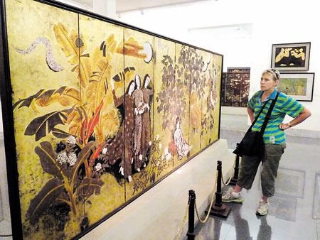 越南美术博物馆陈列教育处干部陶明月说:“博物馆的古代雕刻等古老美术作品吸引了大批观众。但博物馆的优势是在当代美术。这里展示的是越南传统材质绘画作品,如磨漆画。它吸引了很多外国游客,因为磨漆是越南独有的一种绘画原料。”