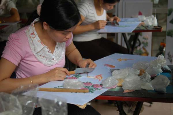 宝石画制作业诞生于上世纪九十年代,在艺人灵巧的双手操作下,经过选石、舂石、粘贴等多个环节才形成各种名牌宝石画。