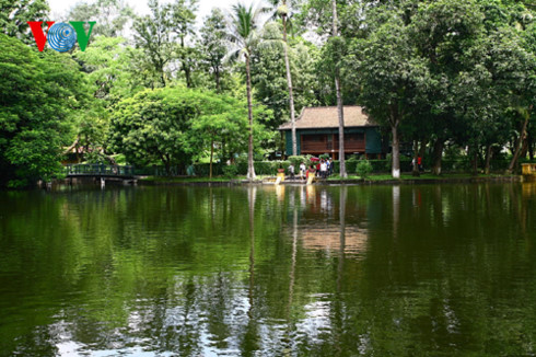 高脚屋旁是一个大鱼池及果实累累的果园。园子里种着很多越南各地同胞赠给胡志明主席的树木。空闲时,胡志明主席常在这儿植树、喂鱼,就像一名普通老百姓一样。