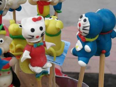 今天,面塑艺人不仅制作动物、水果等简单形象,还捏12生肖或孩子们特别喜欢的宇宙英雄、机器猫、孙悟空、哪吒等人物。制作前,艺人们要想清楚哪种颜色、神态才符合人物个性。例如,捏孙悟空,基本造型是一样的,但在其眼睛、金箍棒、帽子等细节上,不同的艺人会有不同的处理;捏猛将也要突出展现人物的精气神。这一点,有时候也许只有内行才能分辨出来。