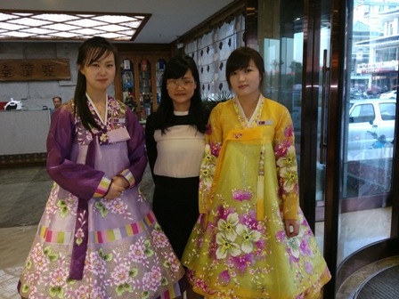 碧顺:这位党委副书记告诉我,她们可不是一般家庭的孩子,而且是由朝鲜政府的安全代表管理。她们很聪明,来工作之前还接受过业务培训,干净、勤快。她们分两人一组。目前,延吉有4、5家这样的饭店雇佣朝鲜姑娘。我还在另一家饭店见到了朝鲜姑娘。她们进行付费的专场演出。