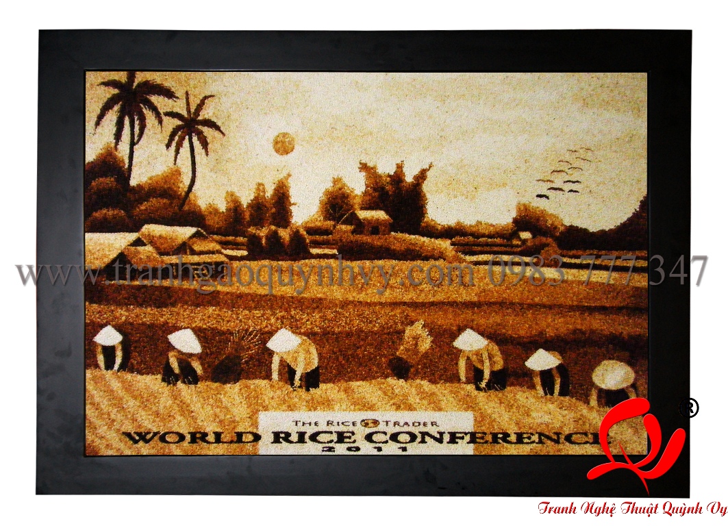 米粒画有肖像画、书法画、风景图、静物画等类别,观赏效果与众不同,别具一格。大米种类尽管很多,但经过高温处理后,通常会变成暖色,主要颜色包括:浅黄、柠檬黄、棕黄、深黄、浅褐色、深褐色、棕黑色和黑色等。因此看起来不是光鲜亮丽,而是带点复古、怀旧的味道。由此,米粒画比较适合越南民间和田园风光等题材。