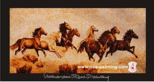 普通人说到大米一般只会想到其食用功能。但米粒画创作者更关心的是每一种大米在干炒或烘干之后的色泽、形状和粘贴效果。为创作一幅米粒画,其作者要花很长时间去寻找、选择大米,并不断总结积累。一幅米粒画的制作要经过多道工序:选米、干炒或烘干使大米有不同的色泽、描廓、粘接、定型、装框。