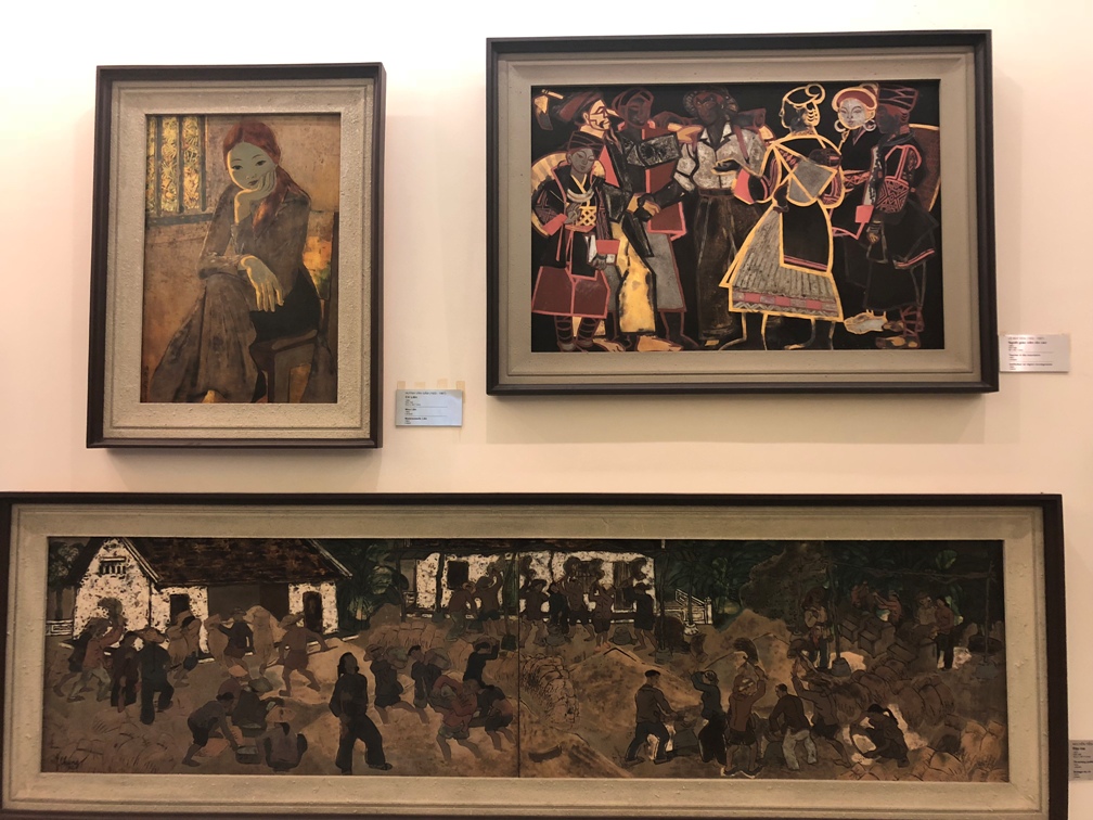 宗教艺术、磨漆画和革命题材作品是越南国家美术馆固定陈列的主要内容。其中令我印象深刻的是描绘越南民间生活的磨漆画。磨漆画是越南的“国粹”,越南磨漆画的最大特点是除了磨漆工艺高超外,其艺术感染力也非常强。越南磨漆画的传统色为金色、黑色和红色。三种颜色搭配描绘出越南生活的千姿百态,农民劳作、儿童戏耍、大街小巷等日常生活场景都极具越南风情。