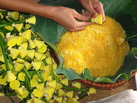 按照传统的冲窨法,把茶叶放在花瓣里,包起来,隔一夜即可饮用。现在则主要用雄蕊花粉来窨制。莲花雄蕊呈乳白色,这是莲花的香袋,取出雄蕊粉,与茶叶一起窨制。随后取出茶叶烘干即可。窨制一公斤茶需要三至四个星期。