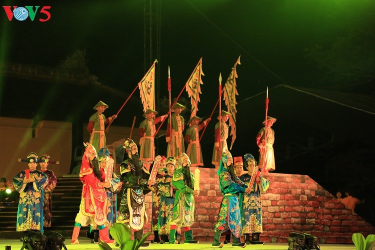 在2018年顺化艺术节上,顺化历史遗迹区紫禁城内的勤政殿变成了一座雄伟壮观的舞台。舞台上的屏幕为LED屏,两侧搭建两座大门。舞台表演以顺化宫廷和传统艺术语言再现19世纪越南的豪迈历史画面。