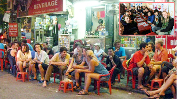 结束了一天的工作,我跟着几个朋友到谢现街喝啤酒。从还剑湖喷泉走到谢现街用不了5分钟。不到300米的街上摆着很多塑料凳和桌子。在这里,一堆堆的外国游客正一边喝啤酒,一边感受河内古街特有的热闹。