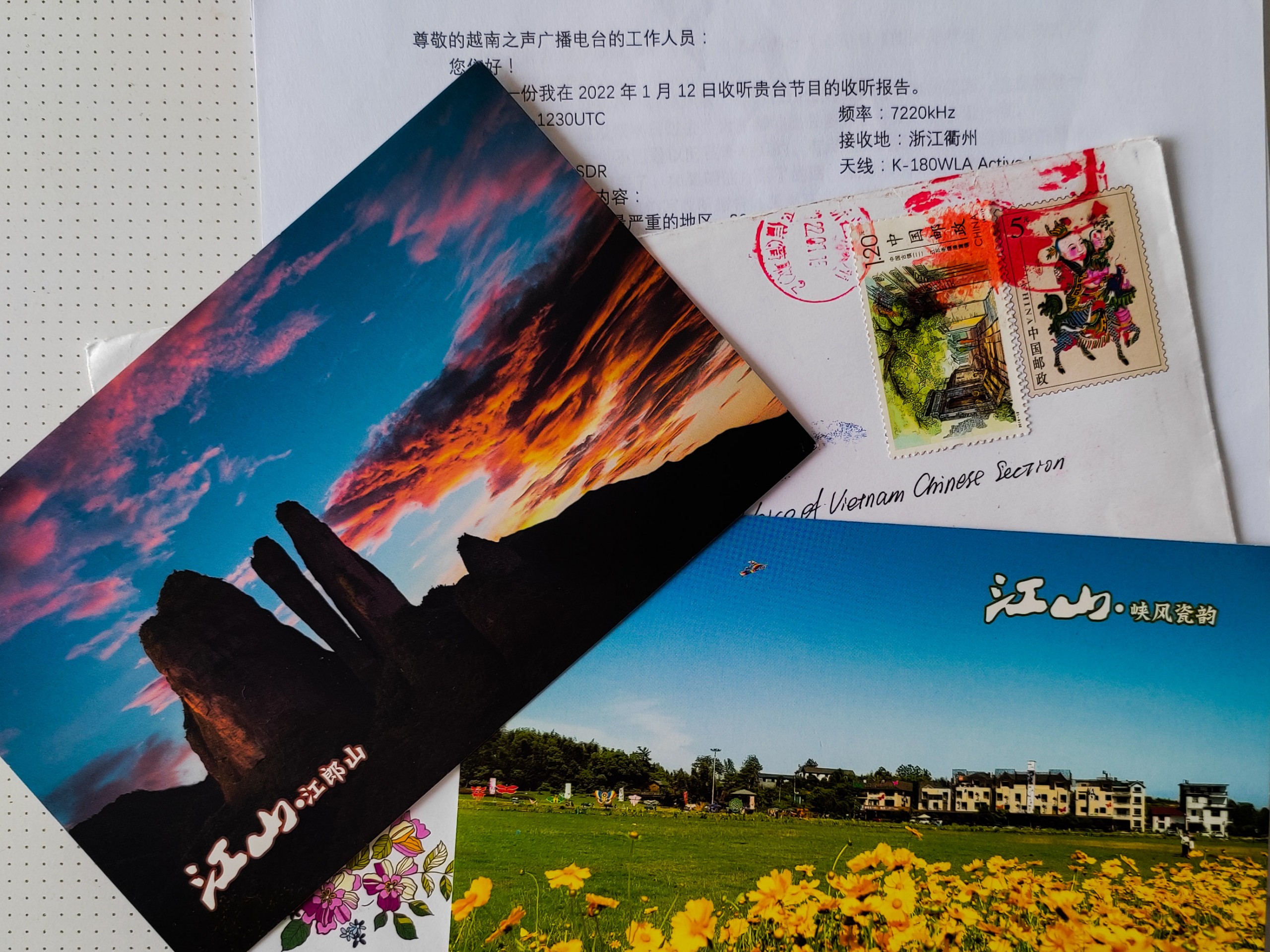 今天的节目,希望介绍给大家的另一封信是由浙江省衢州市听友康祯恒寄来的。康祯恒还顺便向我们发来收听报告,随寄两张漂亮的明信片,上面是美丽的江郎山和峡风瓷韵景区。