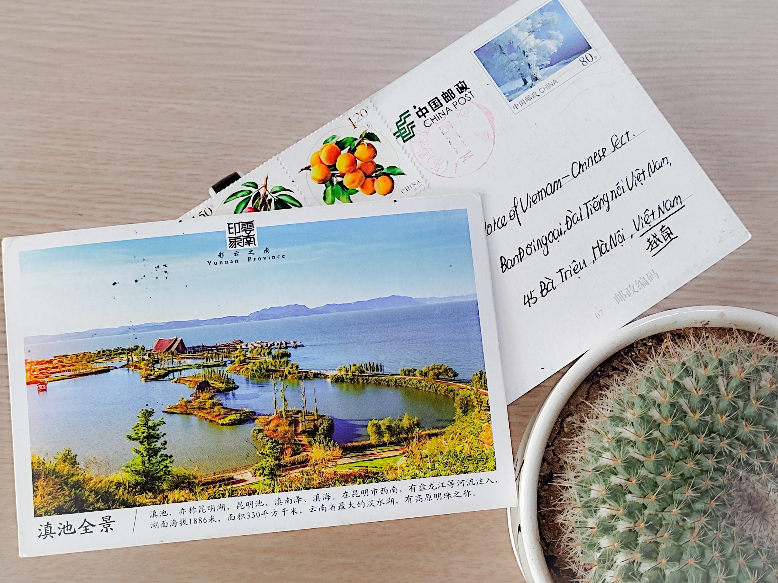 浙江省听众陆达成寄来两张明信片。在明信片上,他除了写下美好的祝福外,还说:“欢迎越南朋友来中国旅游”。谢谢陆达成听众,如果有机会,我们一定会去一趟中国,看看你们国土辽阔,美景如画的国家。