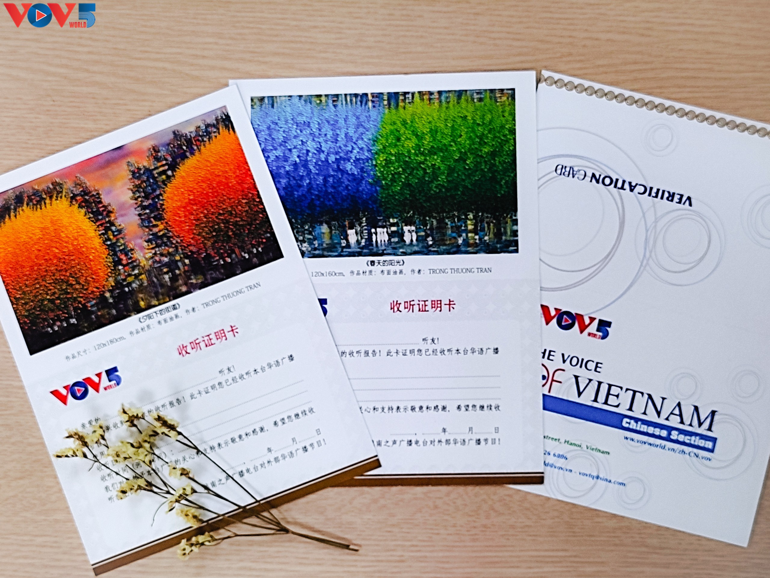 我们的听证明卡规格为15厘米乘20厘米,设计为横向对折;正面和背面是用英文写的本台名称、华语广播节目名称、地址和联系方式;内有我们确认听友收听了本台节目并表示感谢的文字,也有空格填写听友的姓名及收听节目时使用的频率、收听日期和时间。此外,还有越南画家陈仲尚(TRAN TRONG THUONG)特意赠给本台,用于制作收听证明卡的画作。我们华语广播节目这次选择了他的《春天的阳光》和《夕阳下的街道》两幅画,订制了两个版本的收听证明卡。数量有限,欢迎大家抓紧寄来收听报告和信件索取。除了收听证明卡外,我们也将继续送大家越南风景明信片及本台其他纪念品,感谢大家一直以来的陪伴和支持。