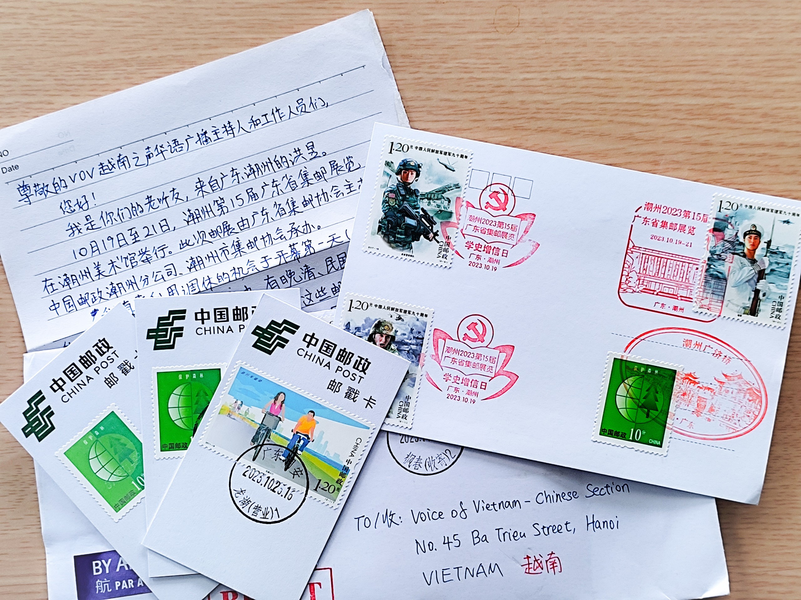 在今天节目的结尾希望给大家介绍的是广东省听众洪昱的一封手写信。信中,洪昱介绍了他最近抽空参观的第十五届广东省集邮展。集邮展在潮州市举行,所展示的邮品有晚清、民国及新中国的,也有港澳台及国外发行的邮票。而除了邮票外,邮展还展示邮戳、信封、明信片、汇款单、退回单等。集邮是洪昱的爱好,他随信也送我们三张邮戳卡及一张盖有邮展章的明信片。