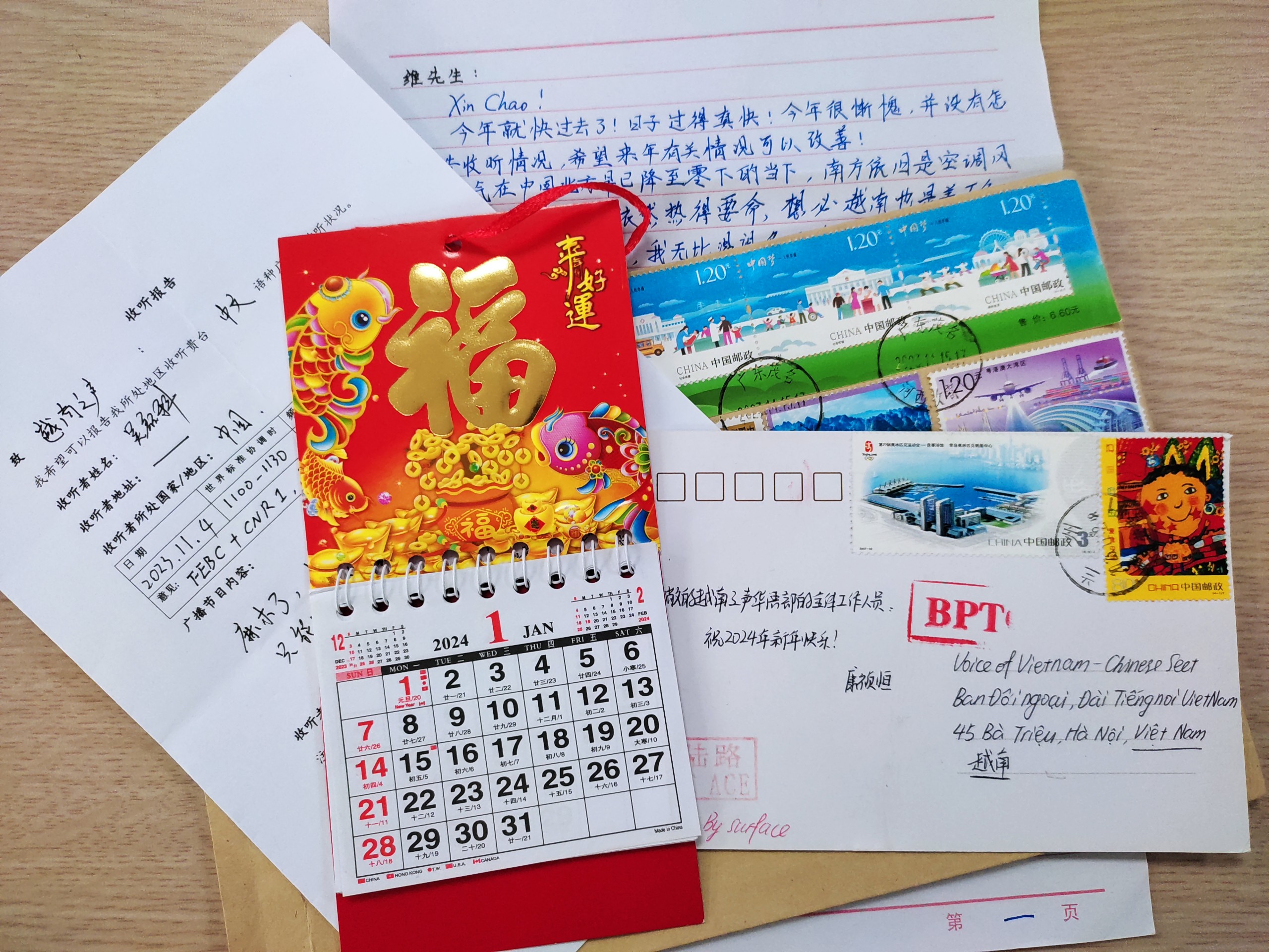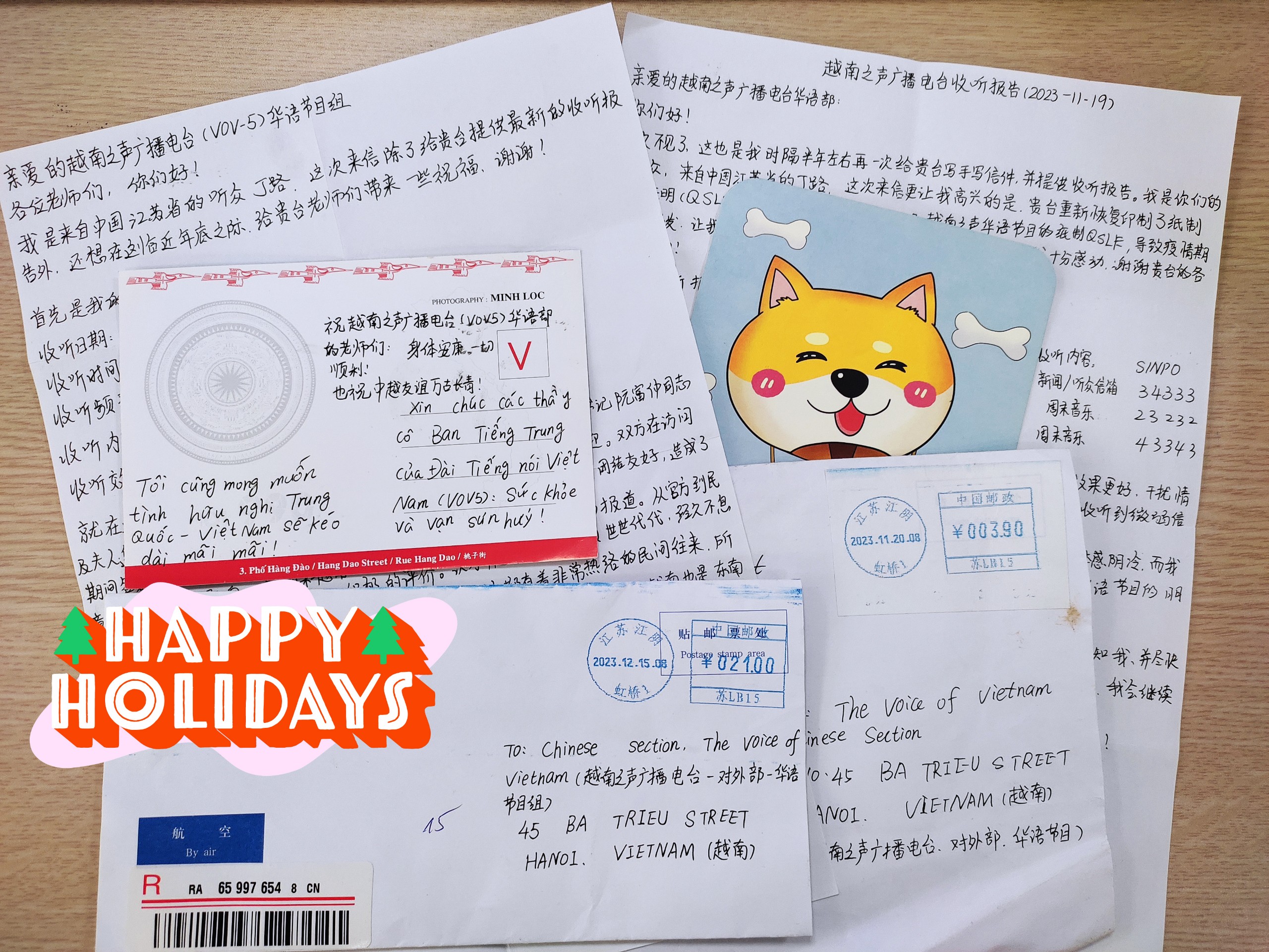 江苏省听众丁路分别于11月20日和12月15日寄来两封手写信。信中,除了两份收听报告外,还有两张明信片。明信片上,丁路用地道的越南语写道:“祝越南之声对外部(VOV5)的朋友们身体健康、一切顺利!祝中越友谊万古长青!”