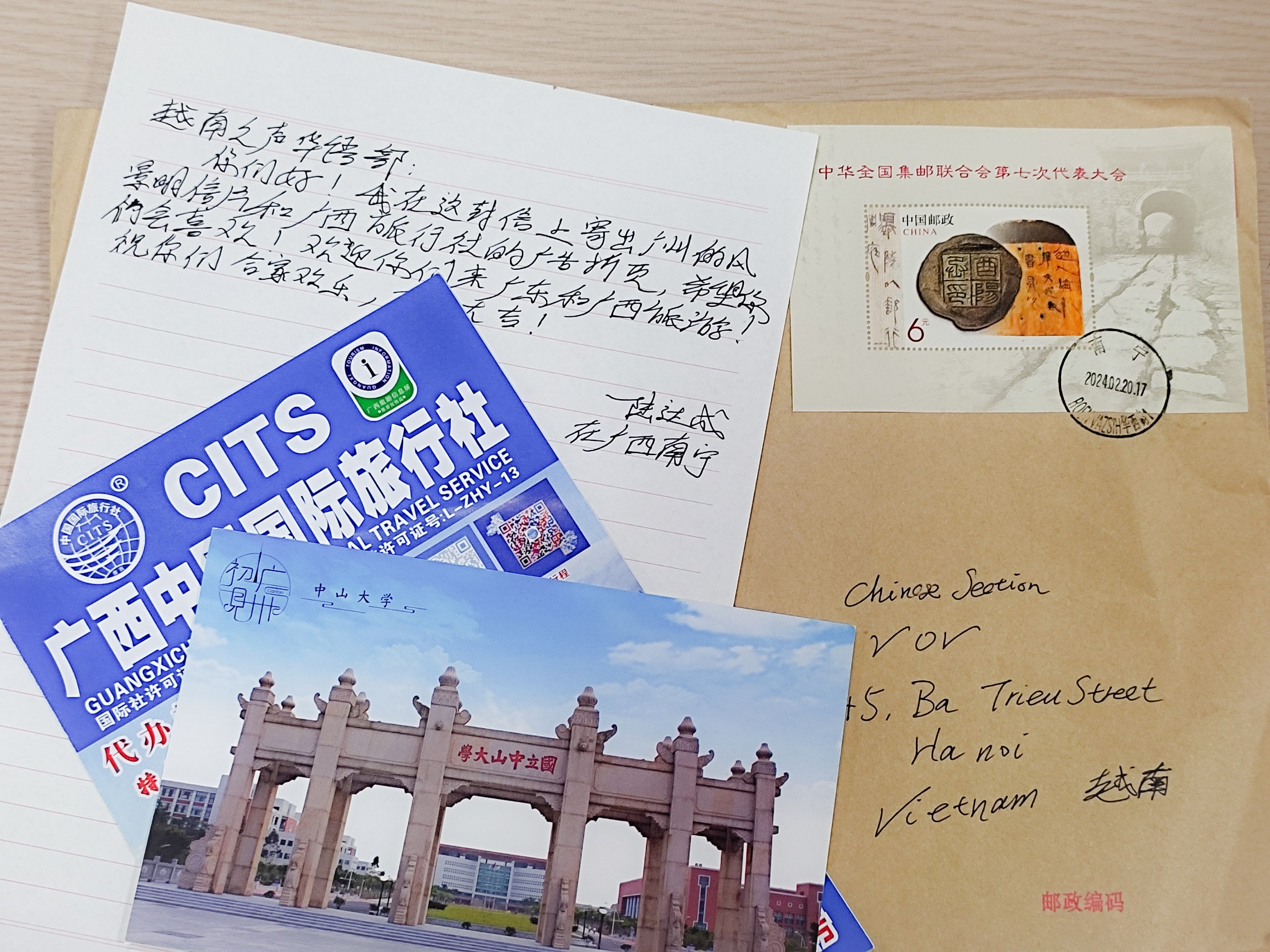 现在浙江工作的广西听众陆达成给我们邮寄来一个很大的信封。里面有一页手写信、一张广州风景明信片,和一份广西旅行社广告折页。他说很希望我们到中国旅游。此外,陆达成还通过电子邮箱给我们发来很多他自己在德天瀑布拍的照片,并和我们分享他春节期间去越南板约-中国德天瀑布旅游的体验。