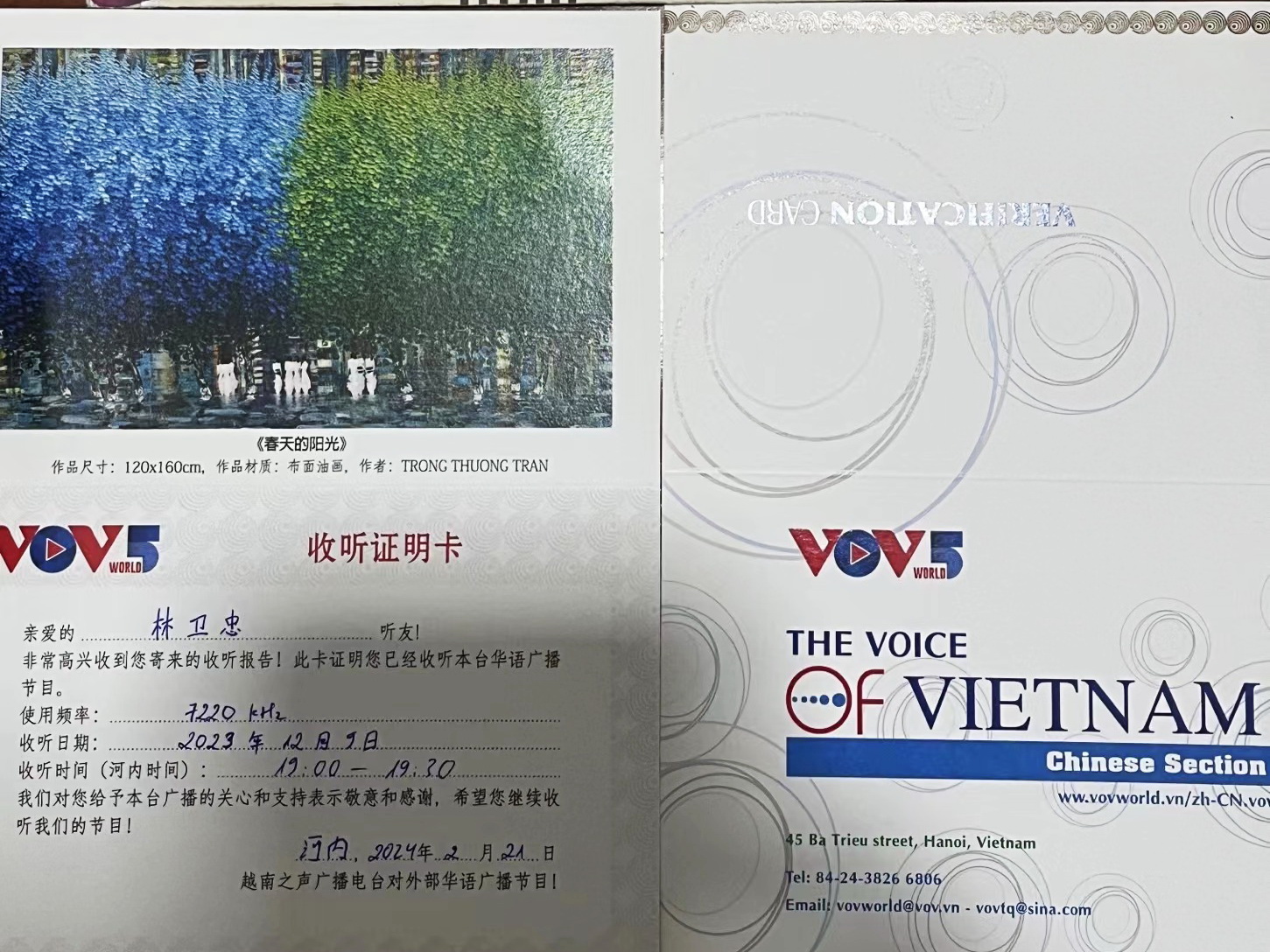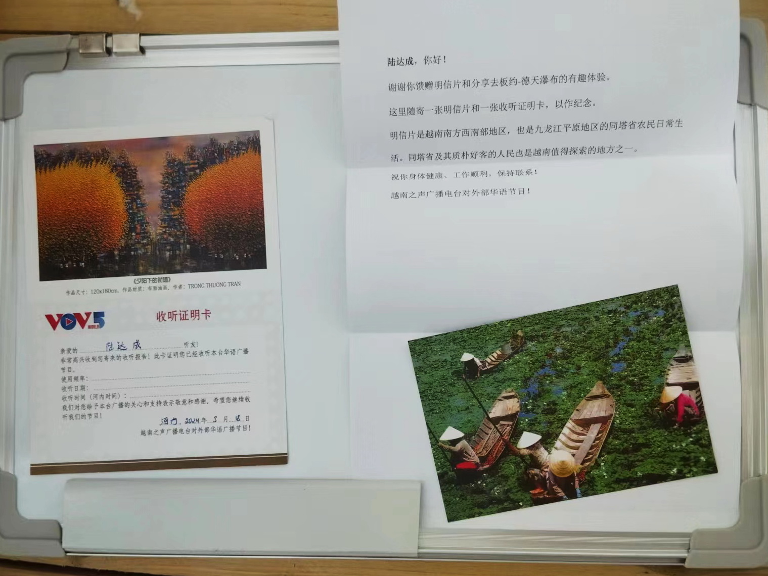 浙江省听众陆达成也来信说:“越南之声华语部,你们好!我很高兴收到了你们从越南首都河内寄来的信件。信封里面有一张越南同塔省的风景明信片、越南之声华语部的《夕阳下的街道》收听证明卡,以及你们的回复信件。我在这封电子邮件当中附上我拍摄的照片,请查收。希望你们在2024年龙年身体健康,工作顺利,心想事成!”