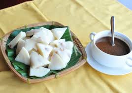 | 把用石灰水煮的花生模子米糕,倒进垫着香蕉叶的簸箕,切成小块蘸豆酱吃 是传统吃法 |