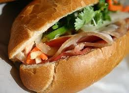 夹肉面包是在1858年至1954年的法属时期传入越南的,一般跟牛奶咖啡一块食用。20世纪初,面包主要夹拌猪肝酱、肉片、黄油、奶酪等,后来为了迎合越南人的口味,人们加上了越南特有的食物,如:肉团片、炸鸡蛋、烤猪肉、灌肠片等,同时还放上一点酸苤蓝、酸胡萝卜、酸黄瓜、香菜等和店主自配的调味汁。河内一家夹肉面包老店老板娘阿杏告诉我们,夹肉面包看起来简单,做起来可是相当讲究。她说:“夹肉面包好就好在猪肝酱。猪肝酱一般用新鲜的猪肝和肥瘦相宜的猪肉制作。先把这两样东西剁碎,然后与紫葱头、食盐、胡椒搅匀,最后蒸3至4小时即可。各种酸菜在腌制前要洗净,晾九成干,再用糖和醋腌制。食用时,放上一点用辣椒酱、番茄酱和蛋黄酱等制成的调味汁。”