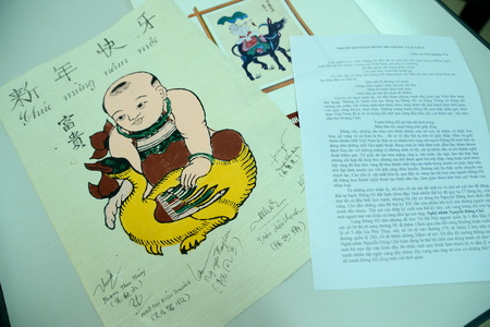 周飞的事迹让我们倍受感动,所以决定送他这份来自河内的特殊新年礼物。画上有我们亲笔书写的越中双语“新年快乐”和华语节目全体采编播人员的亲笔签名。希望你能够喜欢,也请大家在收到贺卡和挂历后尽快通知我们。
