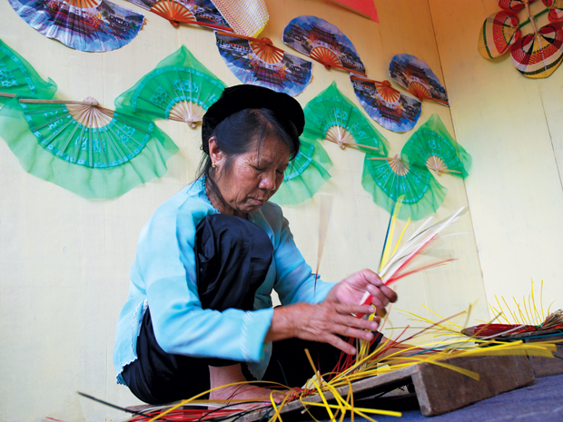 现在,虽然电风扇、空调大行其道,但也有人依然执着于竹篾扇,希望能维护与发扬越南民族这一优良文化传统。做一把色泽鲜艳的竹篾扇需要几道工序,其中包括染色。河内石七县平富村的阿巳做竹篾扇已有多年,她说:“我们用颜料粉来染色。加点黄色的粉,颜色会更加鲜艳。染完后晒30分钟,然后拿来编。”
