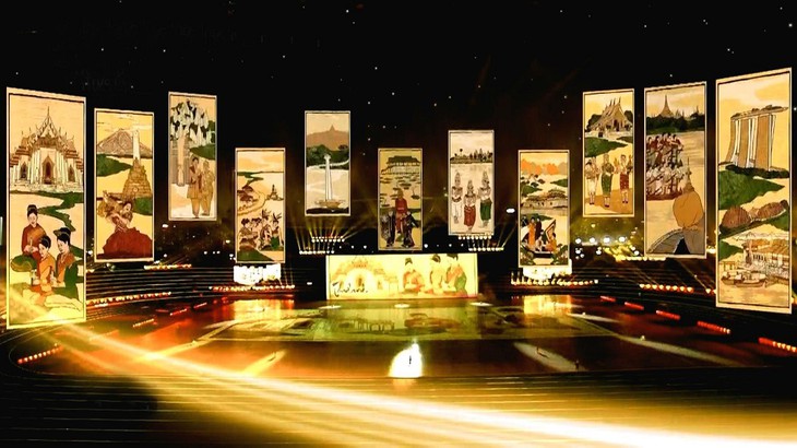 第31届东南亚运动会40个比赛项目及东南亚各国代表性元素以越南传统民间画——东湖画的形式在舞台上放映。图片来源:《Zing》新闻网 |