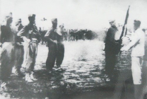 1946年5月26日,胡志明主席探望陈国俊大学并赠送《忠于国,孝于民》绣金六字旗帜。 |