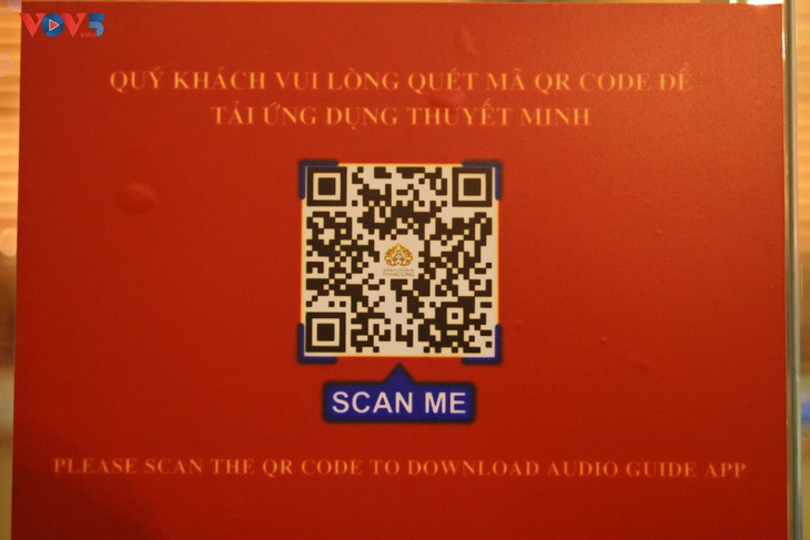 | 越英双语的扫码指引说明贴在升龙皇城缩微模型旁边。 |