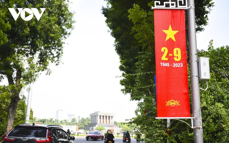 庆祝八月革命和9·2国庆78周年,河内市街道及一些机关、单位和公共场所横挂标语,张贴宣传画和安装大屏幕。