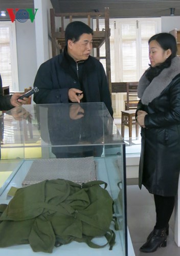 在桂林的越南学校读书期间,老学生们留下了很多用过的学习和劳动工具。照片为越南学校纪念馆馆长(左)激动地讲述纪念馆收藏的1950至1960年一位老学生留下的书包的故事。 |