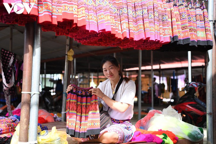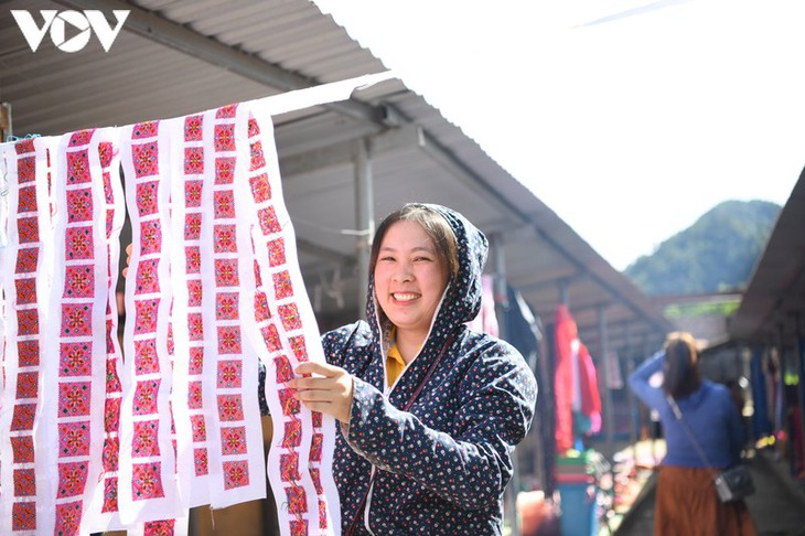 一位赫蒙族妇女热情地介绍价值数百万越盾的服装。 |