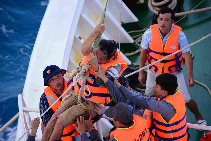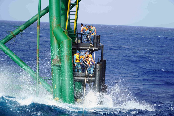 由于风浪大和天气恶劣,DK1 / 20号高脚屋指挥长阮文林中校无法登上高脚屋执行任务。所以,他就穿上救生衣,拿着绳子跳入大海,让高脚屋上的战士拉他上来。