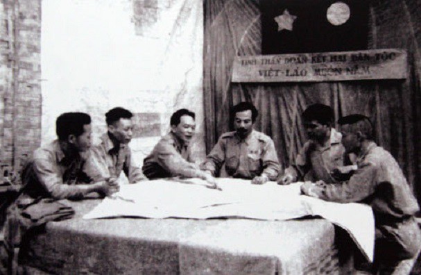 武元甲大将和苏发努冯亲王讨论1953年发动上寮战役的计划,这场战役是越老人民抗法战争的重要转折点。 |