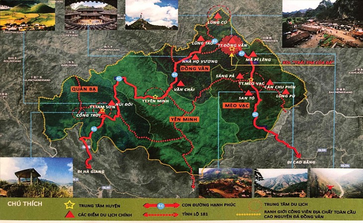 幸福之路是由胡志明主席命名,长达185公里,从河江市到河江省北部管簿(Quản Bạ)、安明、苗旺(Mèo Vạc)、同文等4个高山县。