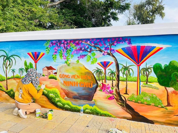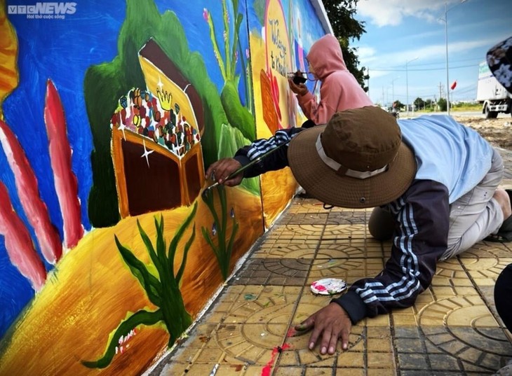 越南纪录组织将这条壁画路列为“越南最长的主题为新农村建设中保护家乡海洋岛屿环境的沿海壁画路”。图片来源:脸书账号“宁顺新日”。