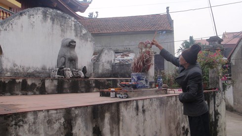 在村头接近一座古寺的一处丘地上有一个约10平方米的祭台,周围建有墙和两根大柱子。祭台上有一组狗像。这些狗都由青石做成,神气地坐着。坐在中间的是大狗,高约1米;周围是群小狗,姿态生动可爱。大狗小狗都面朝西北方向,即巴维山和三岛山顶的中间。
