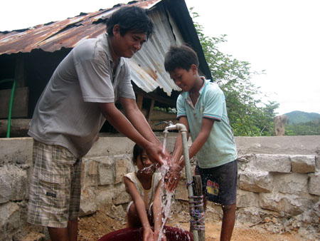 双凤乡塔上村村民裴英俊正在洗蔬菜,准备做饭。据阿俊说,他家十年前就用上了井水。井水经过一个滤水池后,用水泵抽到另一个放在晒台上的水池里。水源充足,足够全家日常使用。不过,他家还建了一个较大一些用来接雨水的水池。他说 :“国家建的洁净水系统还没通到这里。我们主要是用井水和雨水。饮用都是用雨水,因为雨水比较好。天气干旱,不下雨,我们就用井水。现在,雨水很多”。