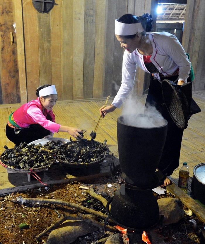 和平省乐山县新立乡第四常村的裴文伦说 :“腊月27,全家人都回家,然后到祖先墓前打扫卫生,请祖先年30回家过年。腊月29即芒历大年初八,开始杀猪,制作各种菜并挂在家里。当天晚上包粽子和煮粽子。第二天即年30凌晨3至4时,全家起床准备饭菜祭祀祖先,请祖先保佑儿孙生意兴隆”。