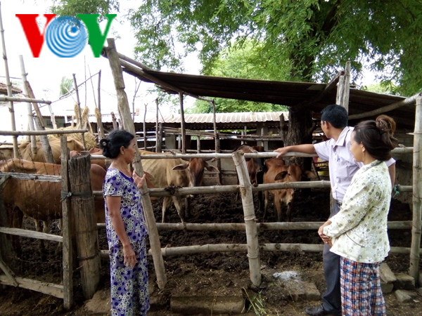 宁福县福荣乡连山村村民芒氏琼一家非常困难。她家有三个孩子,经济来源主要靠打工。连山村动员她加入养牛小组,并交给她两头繁殖母牛。开始养牛后,她仔细照顾,现在这两头牛生长良好。