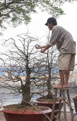 常见的梅花盆景有龙、凤、麒麟和乌龟等仿动物造型,不过田和的花农最常做的造型只有两种:龙舞祥云和神龙天降。若想栽培出一盆美丽的梅花,除了大自然数十年的阳光雨露,花农也要注意每个细节,从花盆的形状到枝条的修剪,一丝一毫不得马虎。最最关键的一点,就是梅树的体态要优美。一盆品质上乘的梅花要做到面面俱佳,也就是说,无论从哪个方向看过去,整棵树都必须像一条栩栩如生的飞龙。