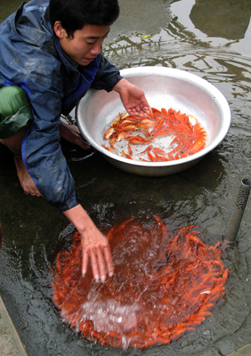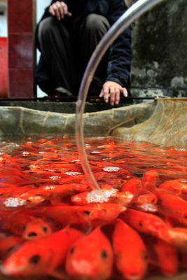 绥禄乡的红鲤和其他地方的不同,这里的鲤鱼身子和尾巴长,颜色深红,体质好,容易饲养。唯一让人奇怪的,就是这里的人都不喜欢养大鱼。在水沉村我们看到,基本上每家每户都有几个池塘,但每个池塘不大,只有七八平米见方,通常一平米水面养5到7百条鱼,这样每个池子可养上万条鱼。阿德是一家养鱼专业户的男主人,他说:“这种红鲤鱼之所以按照一定的密度饲养,是为了不让它长大,因为做供品的鱼不需要大,手指头粗就可以了。”