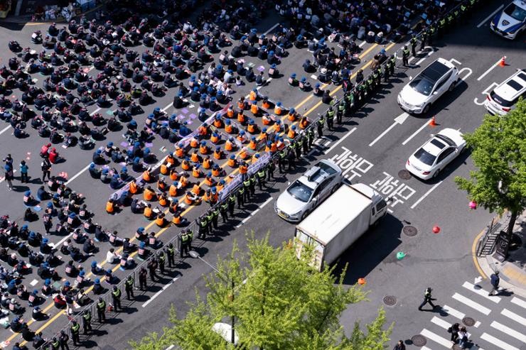 在韩国首都首尔,数千名游行者挥舞旗帜、高喊口号,支持工人。